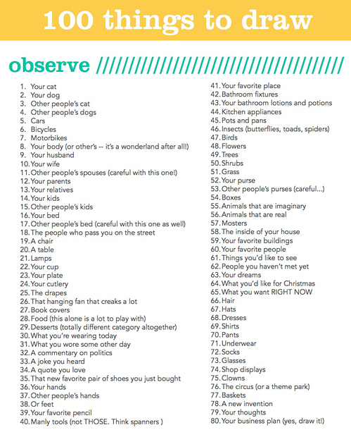 Hoje esbarrei num troço bem legal. As 100 coisas que podemos desenhar, para exercitar nossa imaginação: