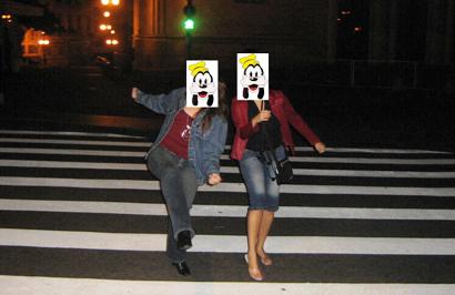 Os pedestres atravessaram, felizes e saltitantes — como as duas patetas da foto acima (eu e uma amiga que não sabe que está sendo exposta no meu blog) — e os carros de trás, que formaram uma fila, começaram um buzinaço.