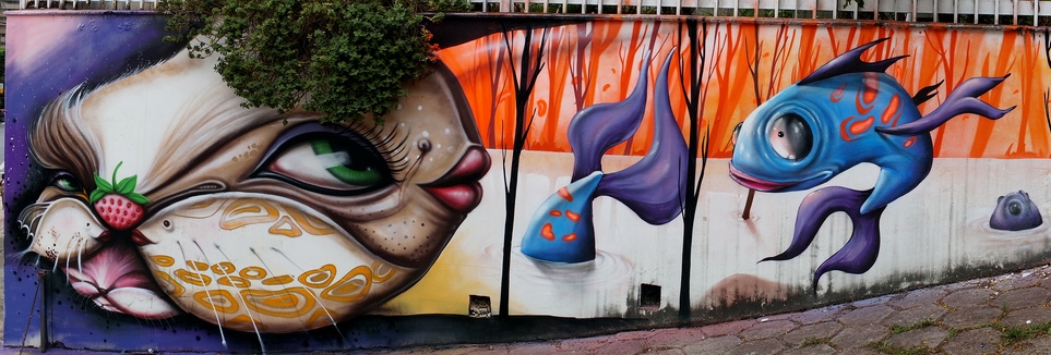 Grafite de Davi de Melo Santos e André Dalata, na rua Gonçalves Dias, perto da Praça da Liberdade, no muro da UNA. Do Flickr de Davi, enviado por ele ao blog: http://www.flickr.com/photos/demelosantos