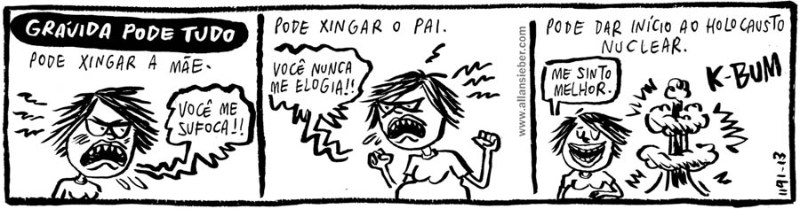 10. GRIPE CRÔNICA – Aprendi que, pior do que adoecer, é adoecer grávida. Você não pode tomar nenhum remédio por conta própria quando está grávida, nem passar pomadinhas, nem nada (pode — e deve — tomar vacina contra a gripe). Tudo tem que ser consultado com o médico. E eu tive a infelicidade de pegar uma sinusite em plenas férias, que me deixou prostrada por uma semana, e tive que tomar antibiótico. Também estou com um tosse de mais de um mês, mas tenho que ficar no (arg) chazinho (detesto chá!). Mas já ouvi amigas grávidas dizendo que passaram os nove meses com nariz entupido ou com tosse. Dizem que é normal (entra naquela lista…).