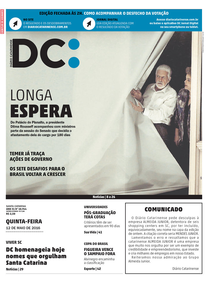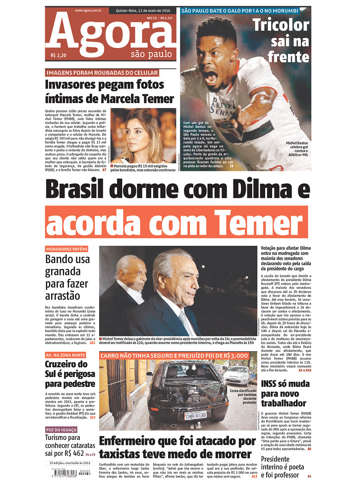 Como alguém que está dos dois lados da bancada — jornalista e leitora crítica, ao mesmo tempo –, tenho grande interesse pelas coberturas, especialmente em dias historicamente importantes, como foi a última quinta-feira, 12 de maio. Gosto de ver as primeiras páginas dos jornais e compará-las: qual exagerou na dose? Qual foi mais inteligente? Qual descambou pro mau gosto? Qual virou um panfletão descarado e nada jornalístico?