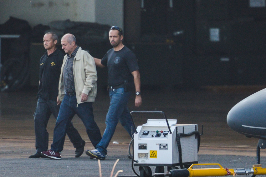 O ex-ministro do Planejamento Paulo Bernardo (de casaco), preso preventivamente durante a Operação Custo Brasil, é transferido pela Polícia Federal para São Paulo. Foto: José Cruz/Agência Brasil