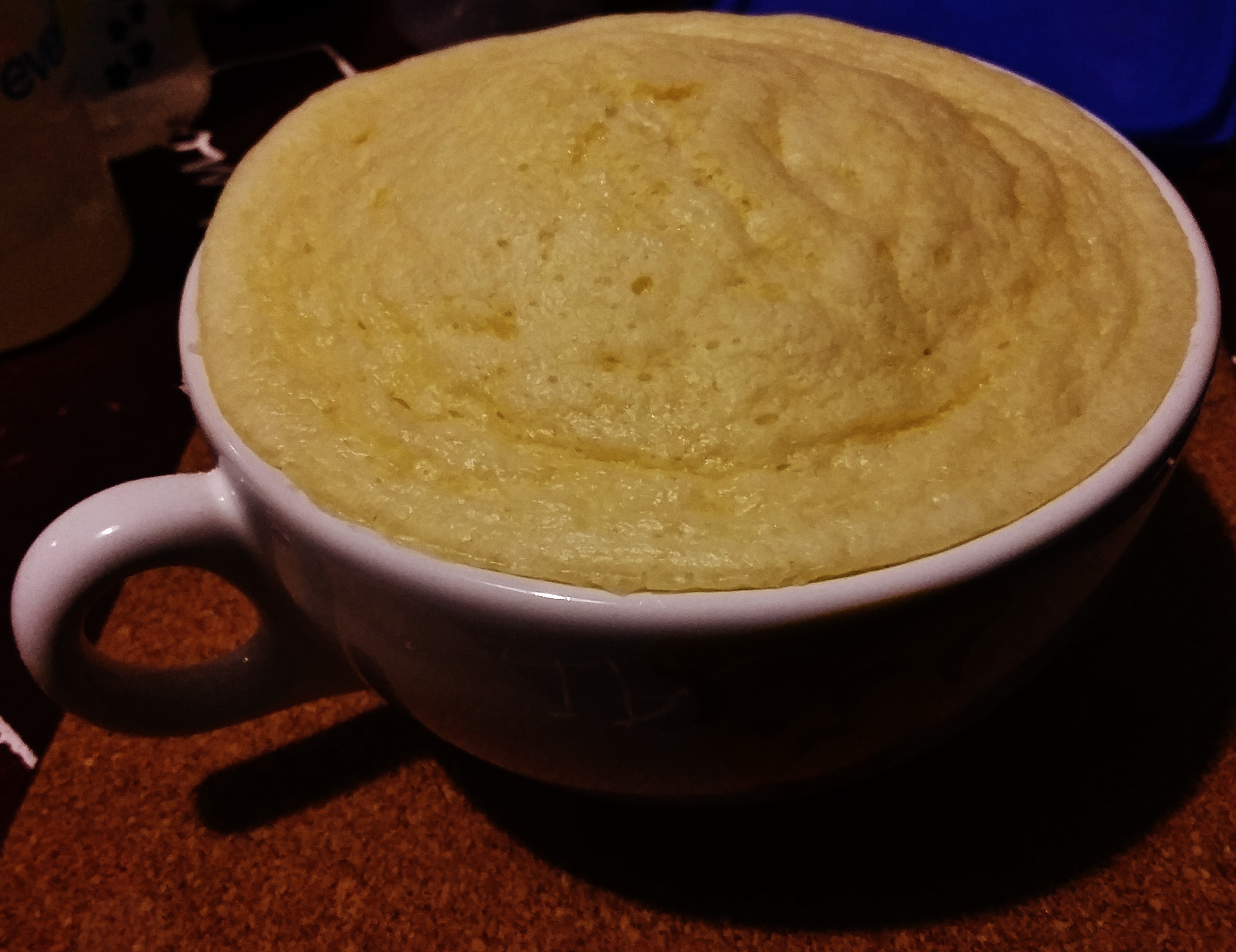 Misture tudo isso em uma vasilha pequena (um caneco ou um pote de sorvete, por exemplo), até formar uma massa homogênea. Coloquei no micro-ondas por 4 minutos, em potência alta (que costuma ser o padrão dos aparelhos).