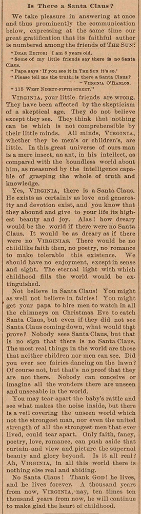 “Caro editor: eu tenho 8 anos de idade. Alguns dos meus amiguinhos dizem que não existe Papai Noel. Meu papai diz: ‘O que o jornal ‘The Sun’ disser é a verdade’. Por favor, diga-me a verdade: existe Papai Noel?”