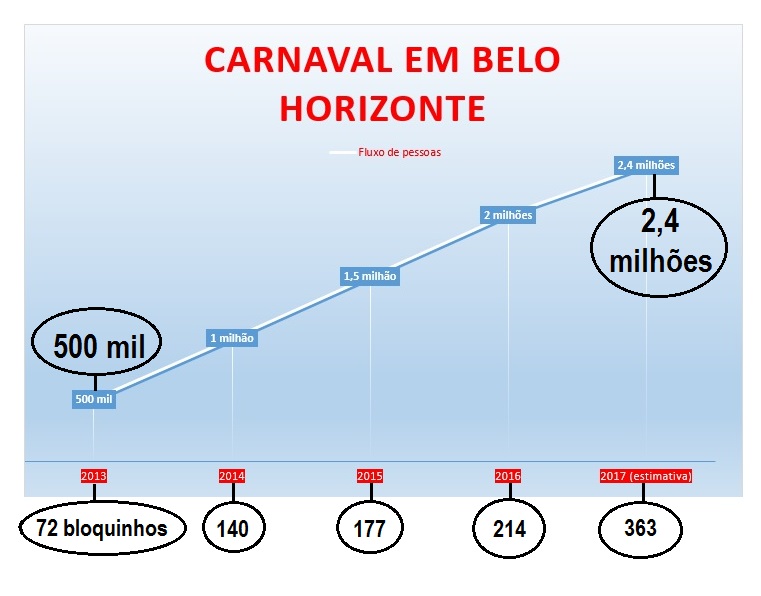 Repare que, em 2013, ano do “boom” do Carnaval de Belo Horizonte, a estimativa de público circulante (fluxo de pessoas) girava em meio milhão.