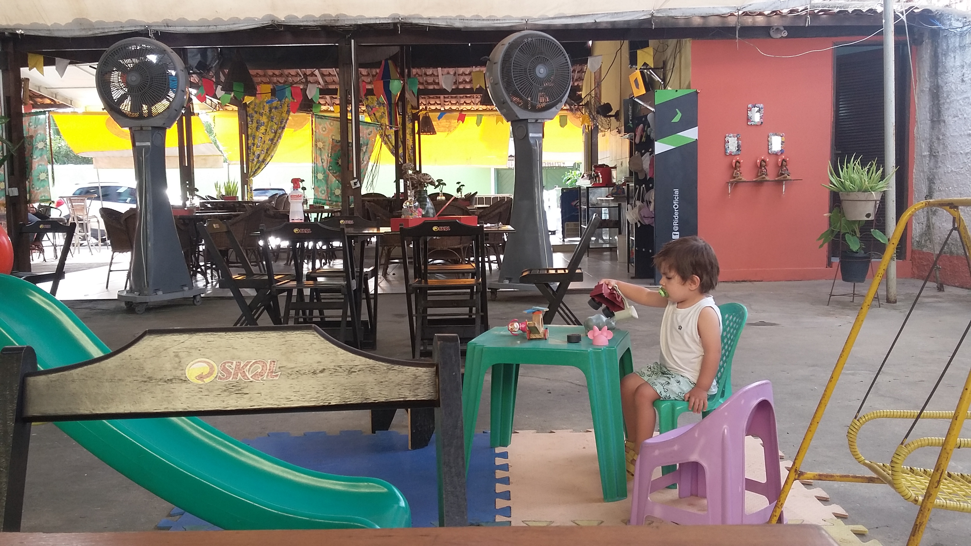 A estrutura de barracas/quiosques é ótima, todas com banheiros limpos, duchas, mesas e cadeiras na parte coberta ou na areia. Elegemos a barraca Vitória’s para ficar, por causa do atendimento supereficiente e gentil do garçom Elias. O preço também era bom – a cerveja de 600l custava R$ 8, enquanto em outras a mesma marca chegava a R$ 12. Recomendo. Ficávamos sentados na mesa à beira do mar, com um guarda-sol gigante fazendo sombra para o Luiz, enquanto ele brincava com os baldes e pás, fazendo amizade com outras crianças de mesas próximas (a viagem foi ótima para ele socializar; em 5 dias, fez 11 amiguinhos!).