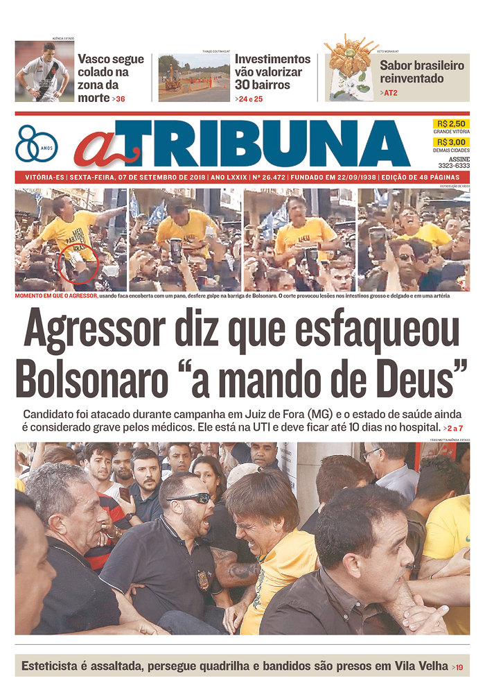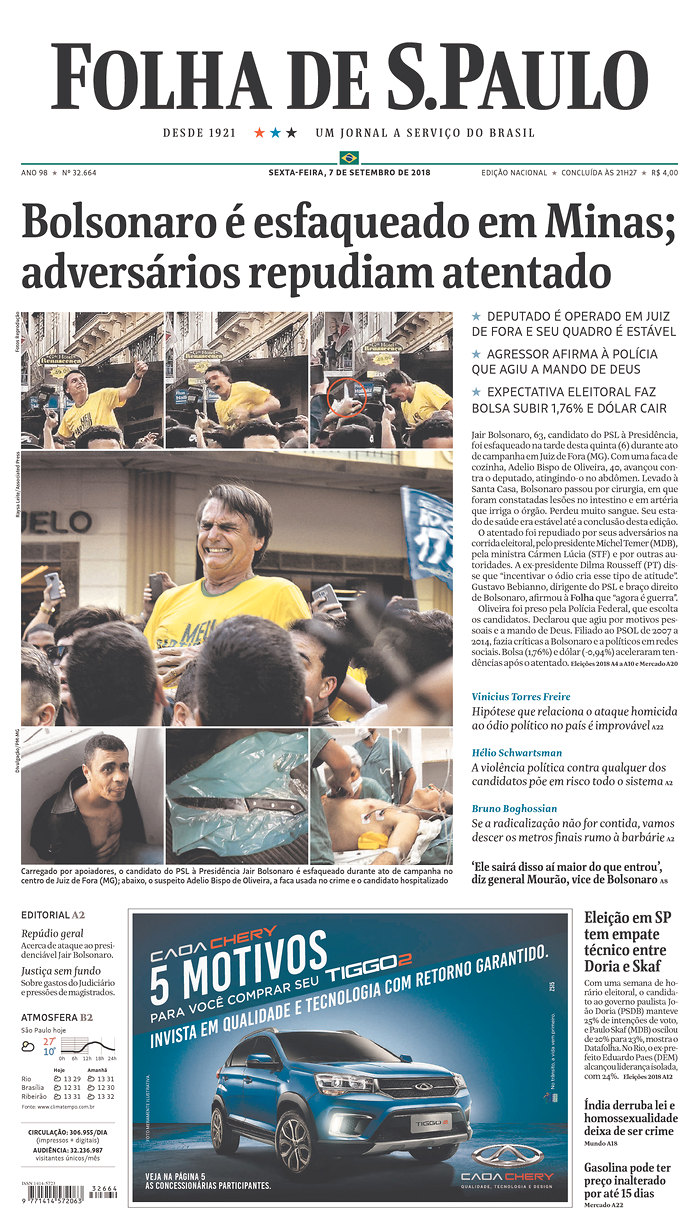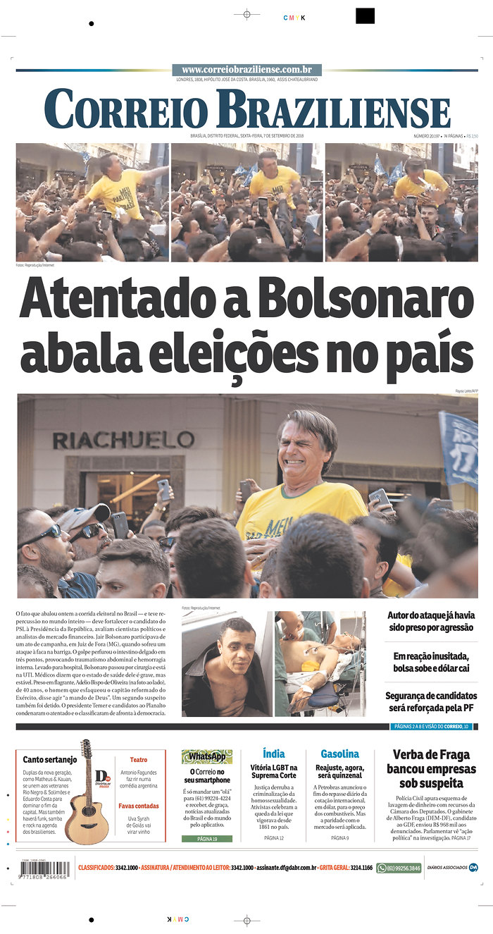 Abaixo, destaco 15 capas de jornal de hoje, mantendo minha tradição de registrar como a imprensa noticiou dias históricos. Porque não há dúvida de que essa facada foi um divisor de águas nestas eleições, e talvez no futuro próximo do país. Qual destas capas você acha que acertou mais (ou errou menos), e por quê?