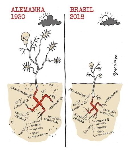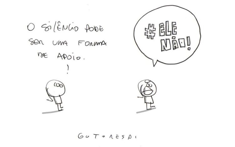 O risco à democracia, com o fortalecimento desse Jair Bolsonaro, é tão grande, que eleitores de todos os matizes ideológicos, gente que vai votar em Boulos/Ciro/Haddad, em Marina/Alckmin, em João Amoedo/Meirelles, em tudo quanto há, estão se unindo por uma causa comum: #EleNão. Pessoas que em 2014 estavam se estapeando nas ruas hoje estão unidas para tentar evitar a tragédia que seria para nosso país se um sujeito como Bolsonaro fosse eleito, ou mesmo chegasse ao segundo turno.