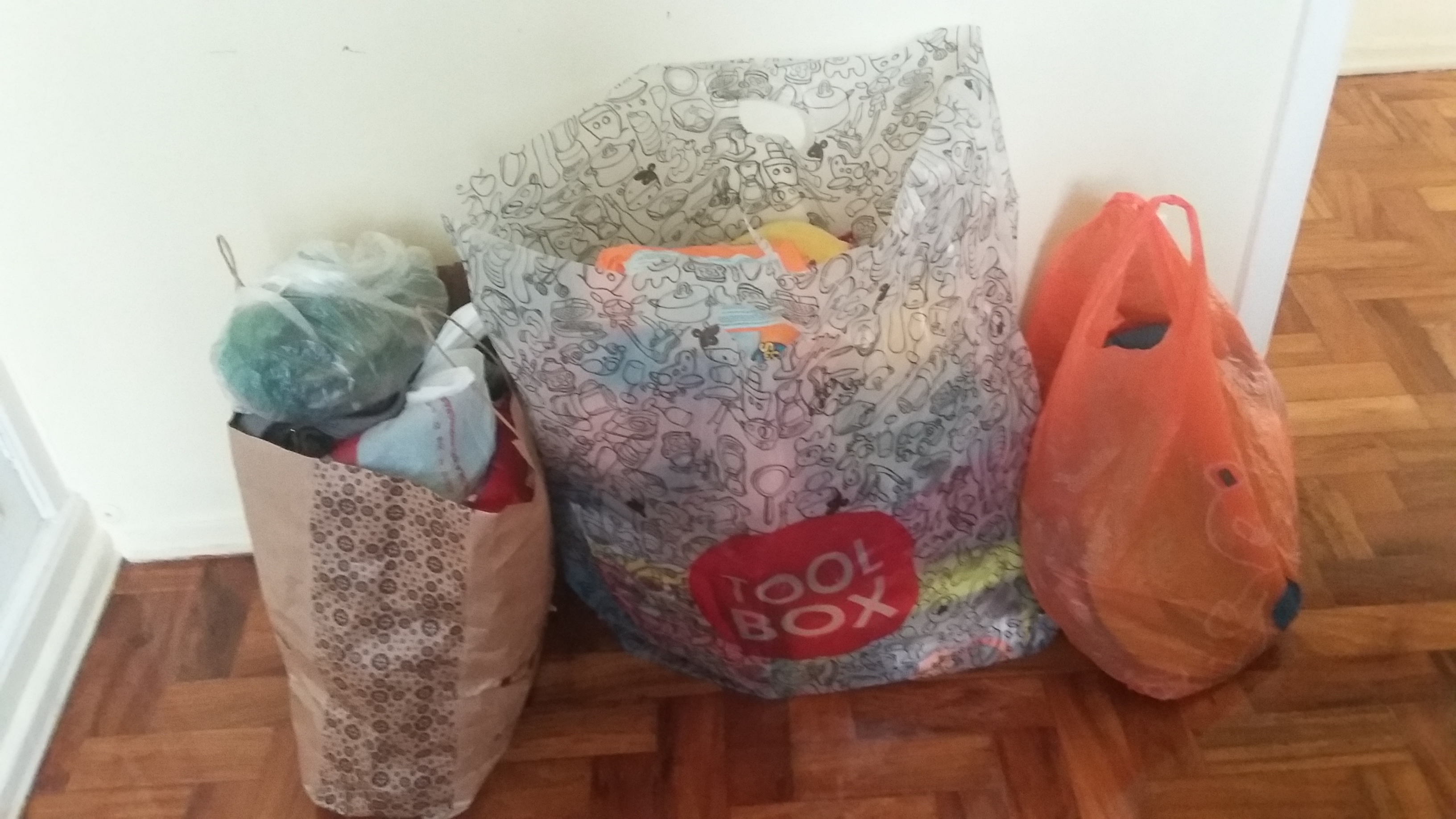 Arrumamos o quarto do pequeno e propus a ele de separarmos os brinquedos que ele não usa mais para doar às criancinhas que não têm muitos brinquedos. Assim como fizemos com os livros há alguns meses. E ele foi pegando os brinquedos “de bebê” e foi colocando sobre a cama, até que formamos uma pilha razoável. Guardamos tudo num saco.