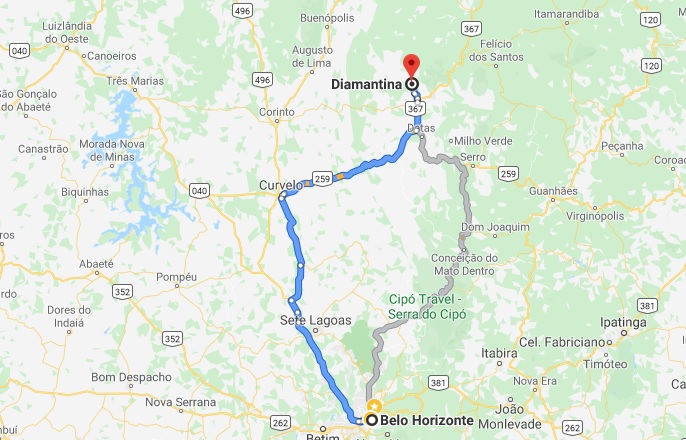 Se não me engano, gastamos cerca de quatro horas de Belo Horizonte a Diamantina, contando as paradas. A dica é pegar a BR-040 só até a saída para Cordisburgo, passando para a MG-231 até Curvelo, quando você vai pegar a BR-259. Por que passar pela MG em vez de seguir pela BR-040 mais tempo? Porque: 1) É um atalho que encurta o caminho; 2) É mais vazia que a BR, já que nem todo mundo prefere a MG; 3) A estrada está um tapete, com asfalto ótimo e pontos de ultrapassagem a todo momento e 4) É uma estrada linda e você ainda vê a cidade de Guimarães Rosa (se for na hora do almoço, pode parar para almoçar no restaurante Sarapalha, que é muito gostoso).