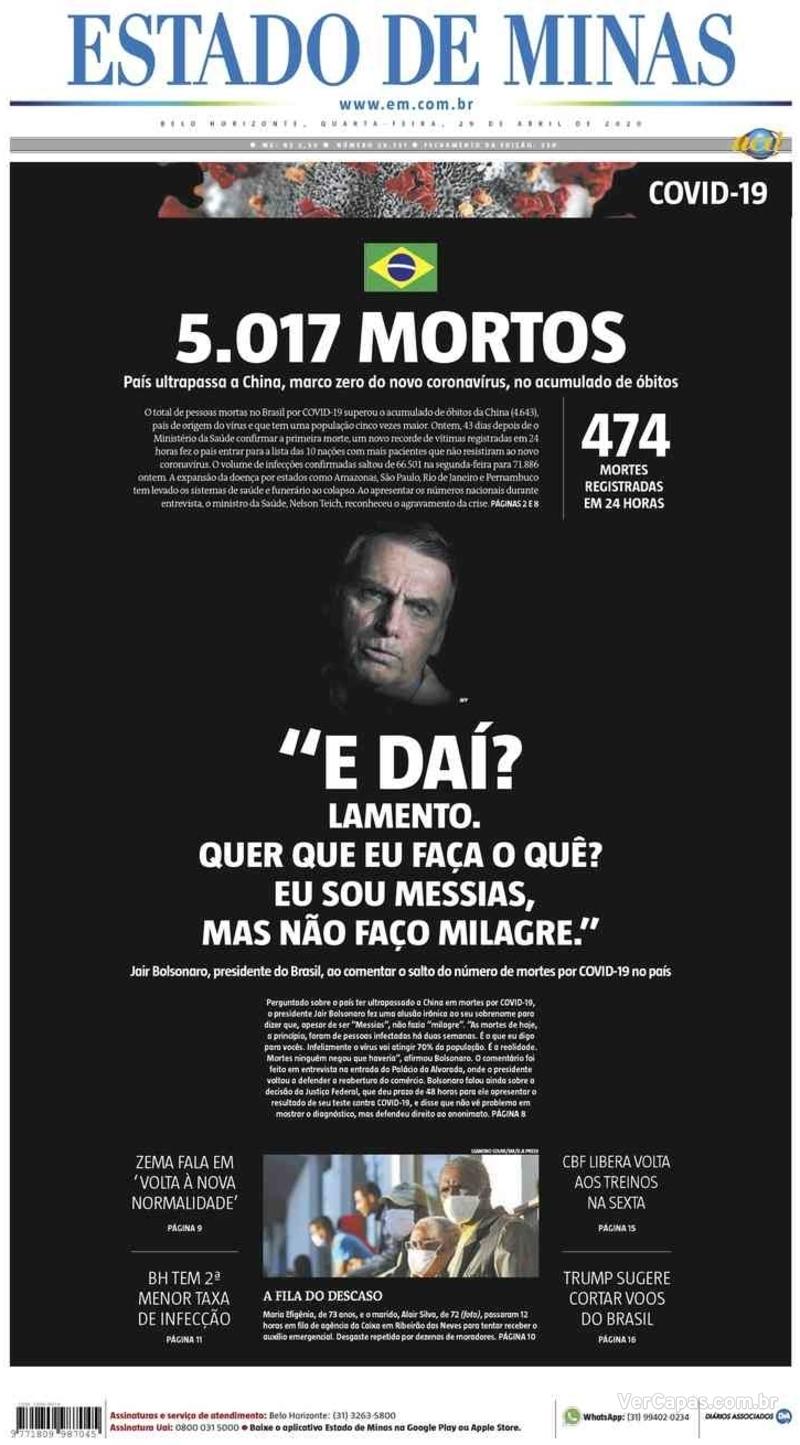 Como foi um dia histórico, com este recorde de mortes e esta frase histórica saída da boca de um chefe de Estado, resolvi separar as capas de jornais, como costumo fazer aqui no blog em dias assim. Mas vou começar pela minha favorita, do “Estado de Minas”. Clique sobre as capas para ver em tamanho real: