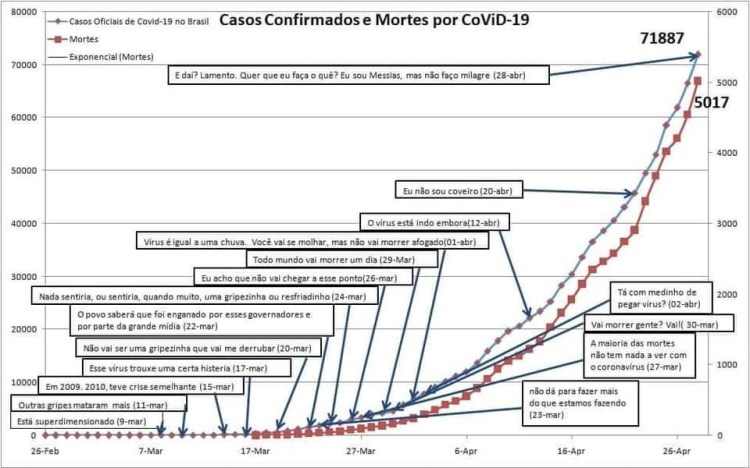 Hoje, ele ainda tentou “remediar” o “E daí?” jogando a culpa das mortes para governadores e prefeitos. É o contrário. Não fossem os governadores e prefeitos, que estão tomando medidas importantes de isolamento, fechamento de comércios e praças e de obrigatoriedade do uso de máscaras, o número de mortes no Brasil já estaria muito maior. Mas muito mesmo.
