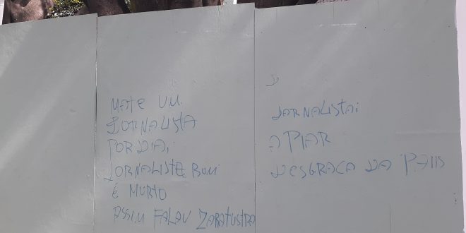 Fico feliz com a postura do Ministério Público, da Polícia Civil e do Sindicato dos Jornalistas. Espero que o autor dessas pichações seja encontrado e punido. Mas ele não está sozinho, infelizmente. Há vários outros destilando ódio ao vivo ou pelas redes sociais, seja contra jornalistas, contra congressistas, contra enfermeiros, contra cientistas, contra juristas – contra qualquer um que demonstre a existência de graves problemas neste projeto de poder fascista que chegou ao Planalto com a família Bolsonaro.