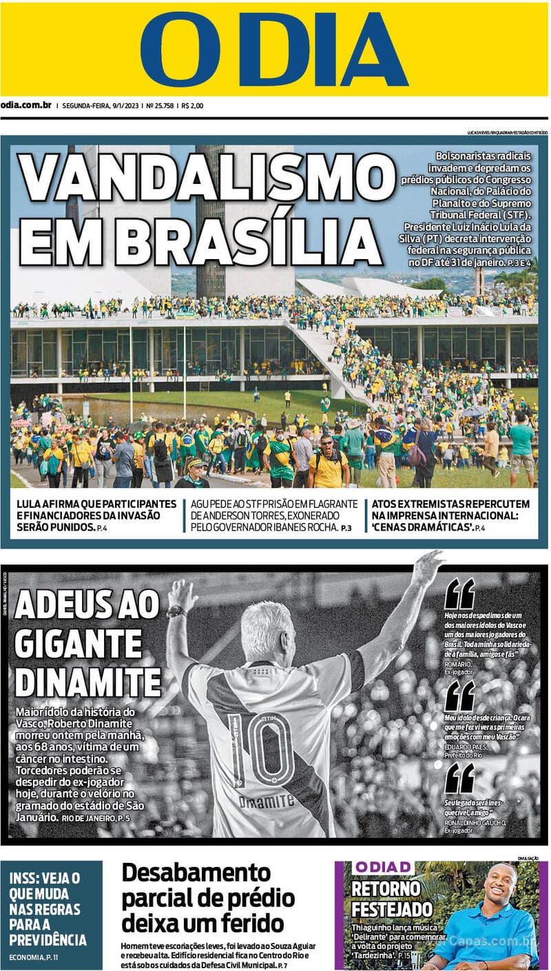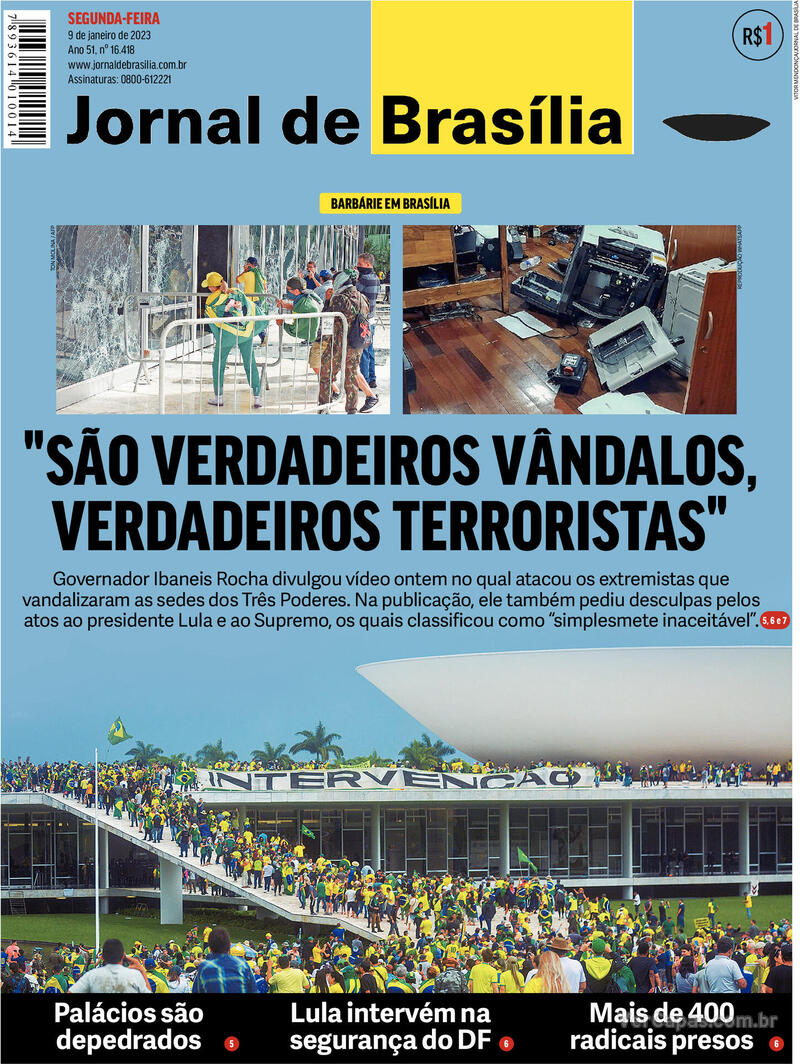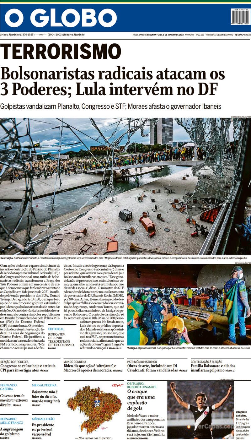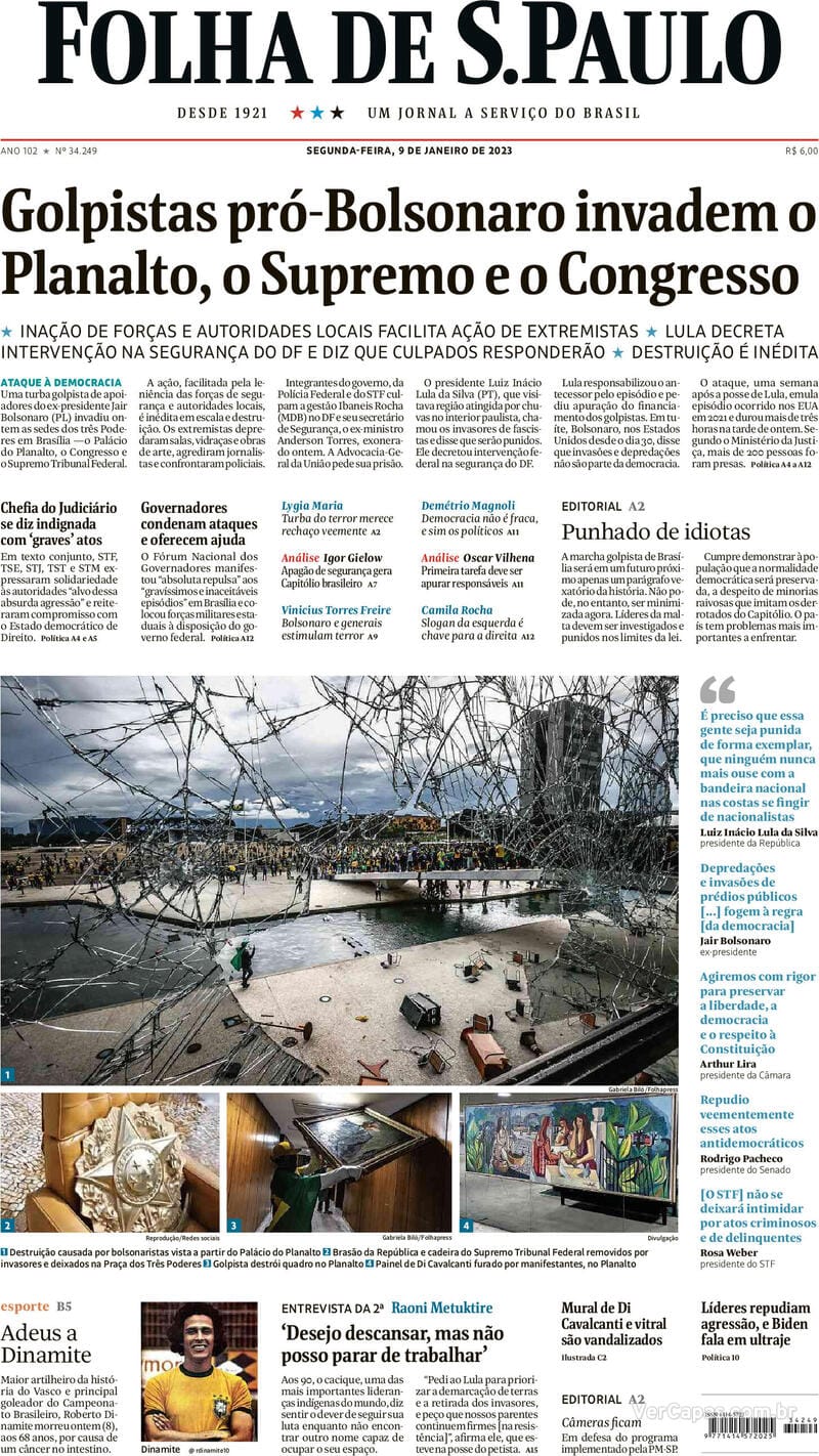 Veja, a seguir, as primeiras páginas de jornais desta segunda-feira, 9 de janeiro de 2023, sobre o ocorrido na véspera. Clique sobre qualquer capa para ver todas em tamanho maior: