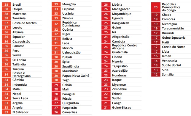 - a média regional para as Américas também ficou em 43 pontos (nosso vizinho Uruguai recebeu nota 74, empatado com o Canadá, no topo do ranking do continente),