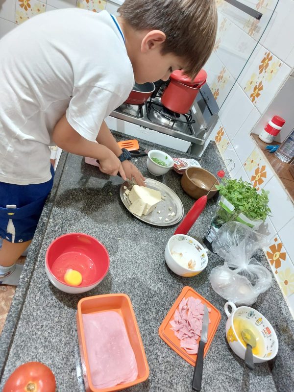Tive a ideia de fazer um verdadeiro “festival de omeletes” para incentivar o Luiz a experimentar sabores diferentes. Foi divertido montar essa linha de produção e inventar misturas, assim como fizemos com os sucos.