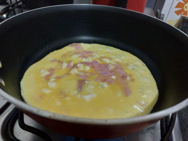 3. Depois acrescente os ingredientes de cada omelete e leve a uma frigideira antiaderente.