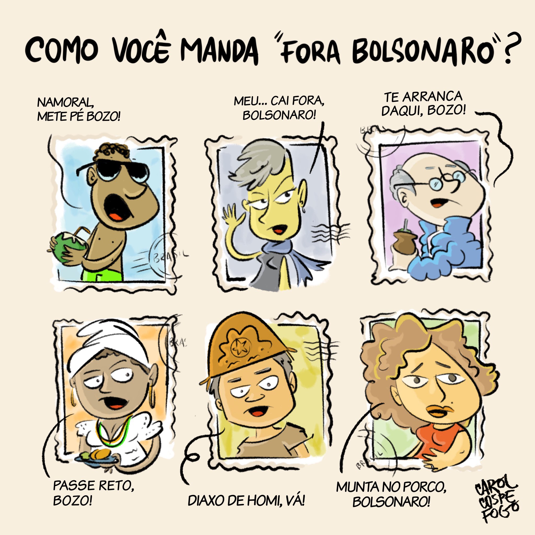 Deixo, a seguir, algumas charges da Carol Cospe Fogo, que encontrei eu seu Instagram e Twitter, para que possam ser sempre reencontradas e espalhadas por aí. Vocês vão ver que a maioria é bastante politizada e crítica às atrocidades do (des)governo Bolsonaro. Ou seja, artes NECESSÁRIAS.