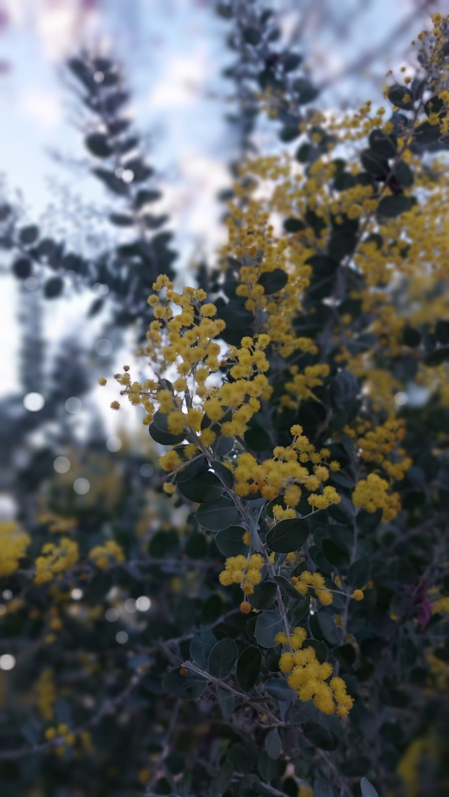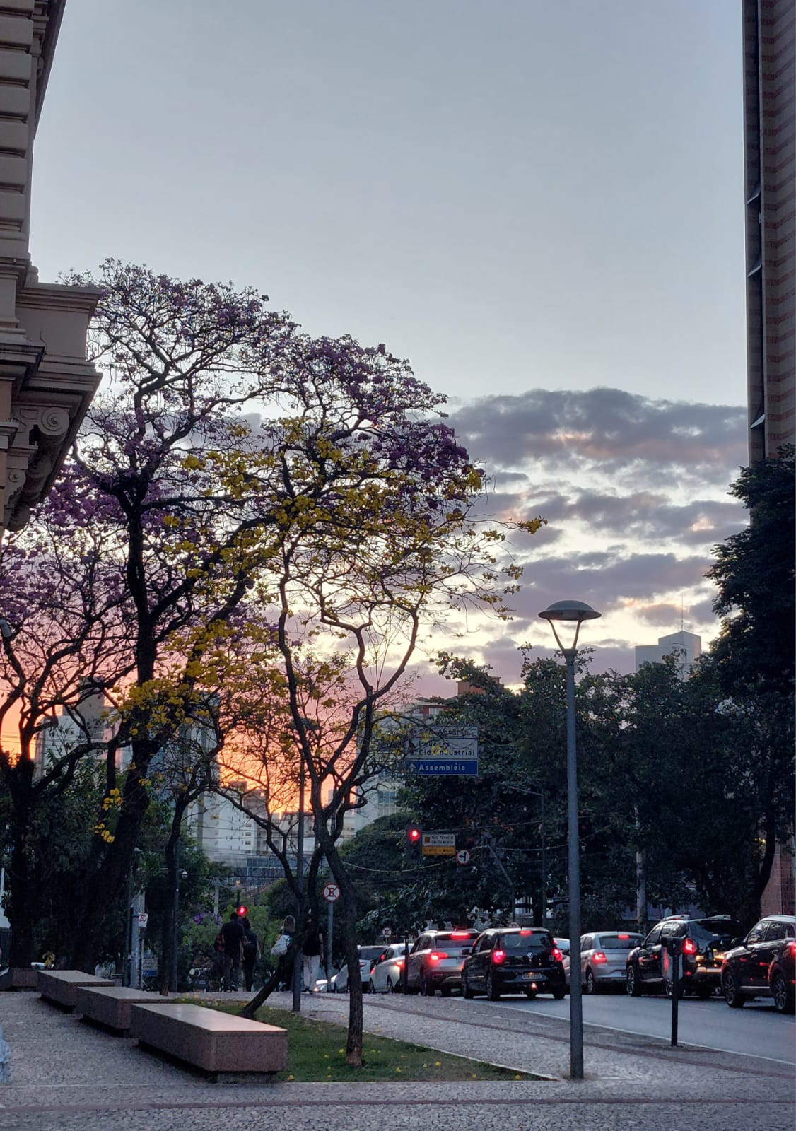 Vi tapetes de flores de ipê roxo, e também ipês amarelos e brancos, vi crianças pegando as florezinhas que caíam como flocos de neve (ou bolhas de sabão), também vi acácias floridas em longos buquês cor de ouro. Vi um pôr-do-sol de cenário para mais árvores coloridas.