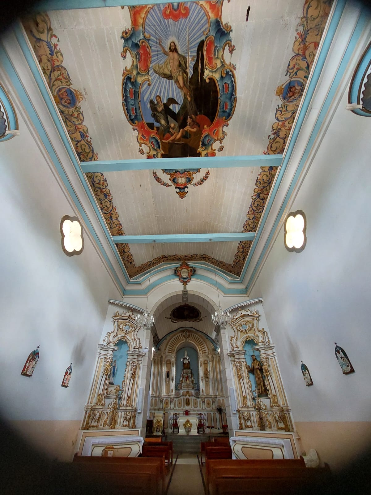 - Centro histórico – tem uma praça, cercada de lojinhas de artesanato (fomos no domingo, então só tinha uma aberta), e a Igreja Matriz de Santana dos Montes, que foi erguida em 1749. Do lado de fora, ela parece simples, mas dentro tem pinturas imponentes feitas por Francisco Xavier Carneiro (aluno de Athayde) e imagens dos séculos XVIII e XIX.