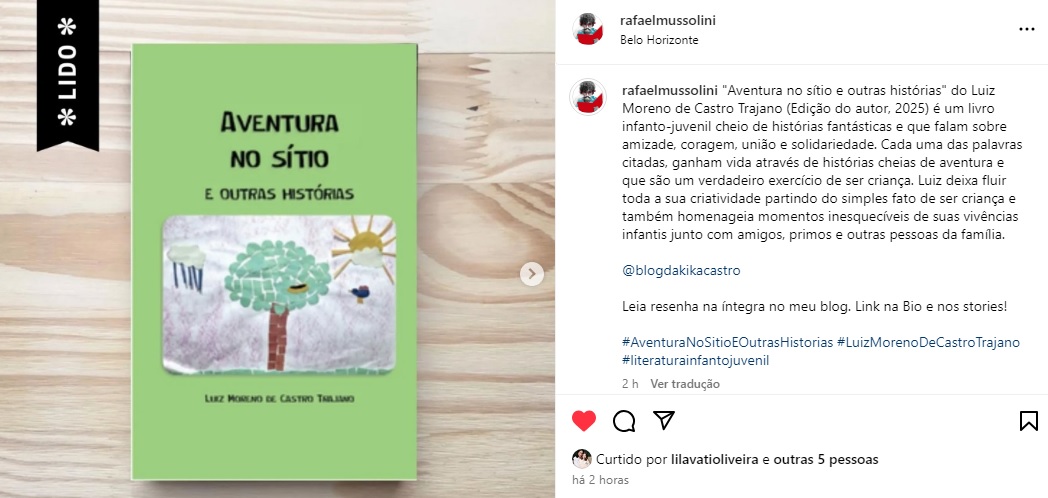 “Aventura no sítio e outras histórias” do Luiz Moreno de Castro Trajano (Edição do autor, 2025) é um livro infanto-juvenil cheio de histórias fantásticas e que falam sobre amizade, coragem, união e solidariedade. Cada uma das palavras citadas ganham vida através de histórias cheias de aventura e que são um verdadeiro exercício de ser criança. Luiz deixa fluir toda a sua criatividade partindo do simples fato de ser criança e também homenageia momentos inesquecíveis de suas vivências infantis junto com amigos, primos e outras pessoas da família.”