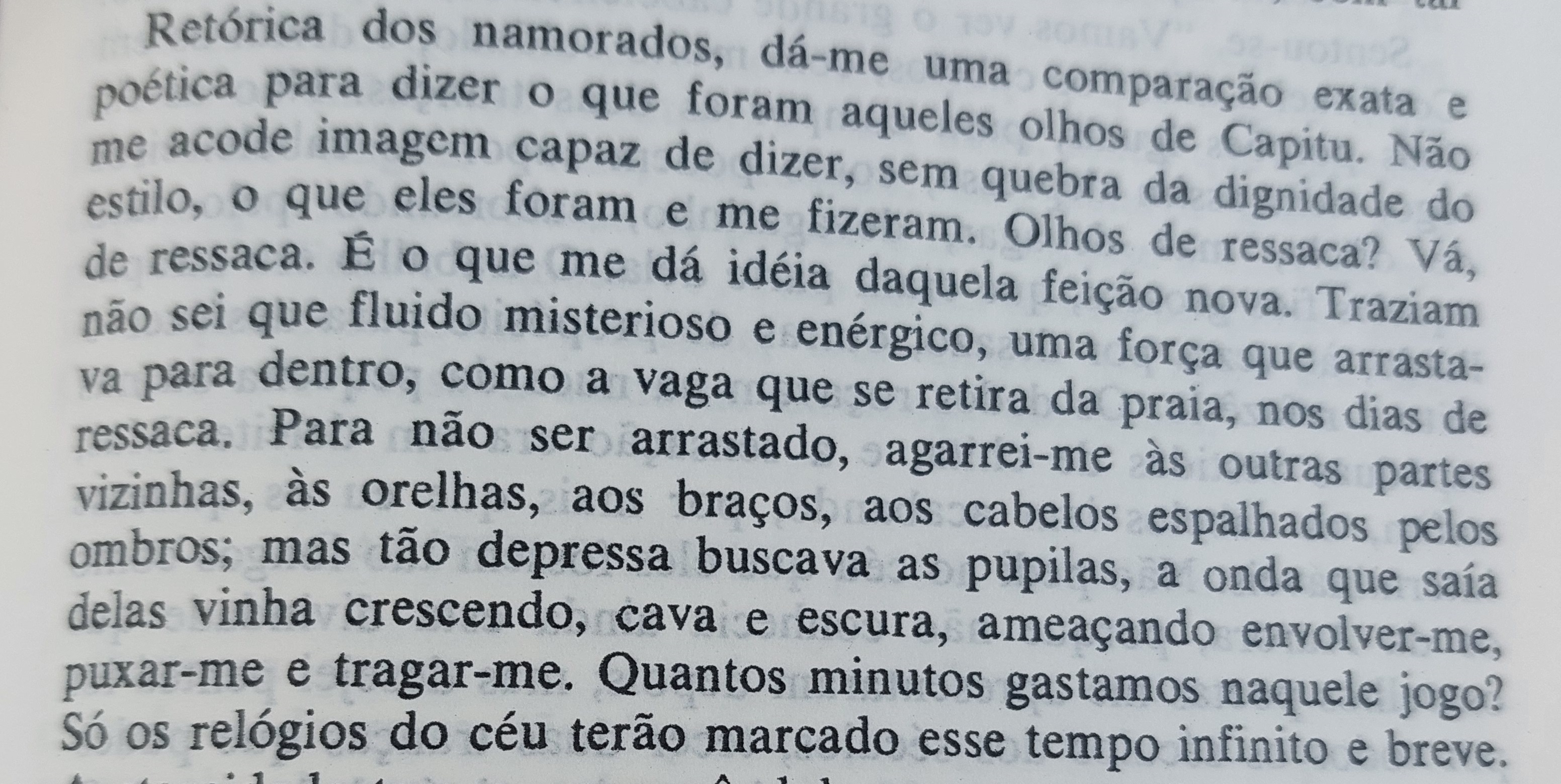 Não sei por que demorei tanto a ler a história de Bentinho e Capitu, só sei que ela foi ficando encostada, sendo adiada, e foi só agora, quando ganhei um velho exemplar num sábado com doações de livros feitas pela melhor biblioteca de BH, é que me animei a ler.