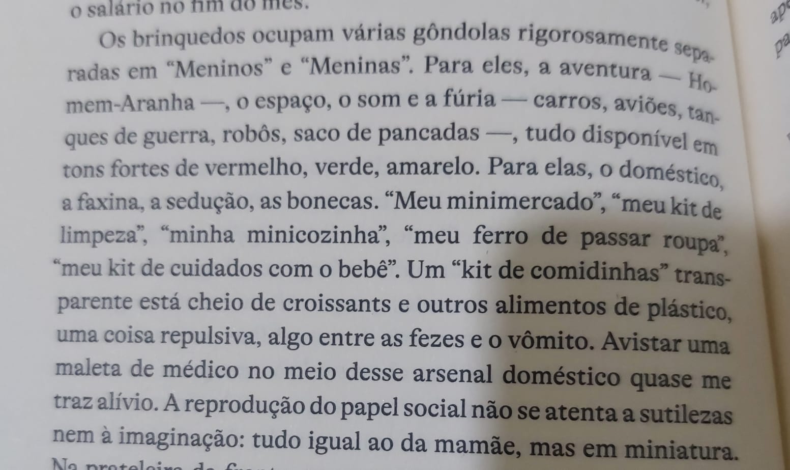 São muitos trechos bons, na verdade. Como quando ela diz que os clientes que saem pela porta de quem não comprou nada se sentem constrangidos, porque os seguranças ficam de olho nas mochilas e bolsos para ver se não levaram nada mesmo. Como se já fosse um crime entrar e sair de um supermercado sem comprar nada.