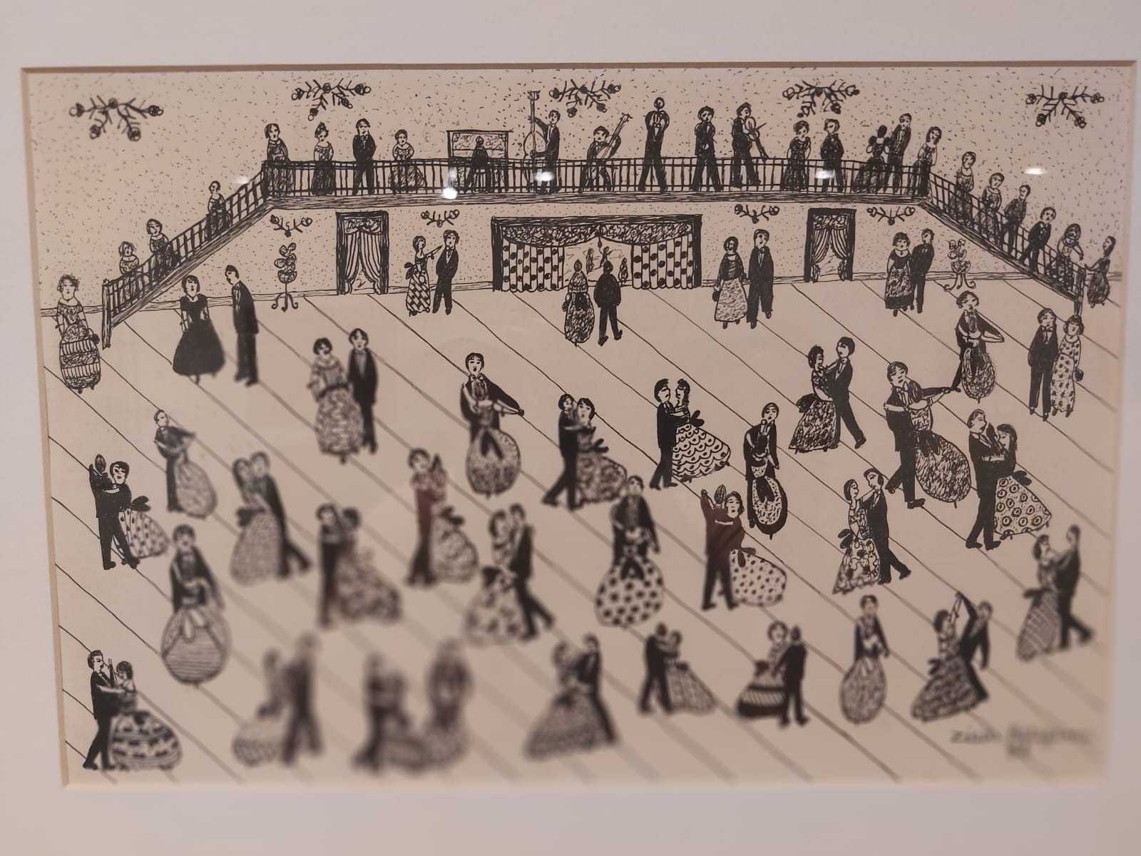 Obra Baile, de 1982, de Zica Bérgami, nascida em Ibitinga (SP) em 1913 e morta em São Paulo (SP) em 2011. Bico de pena sobre papel: