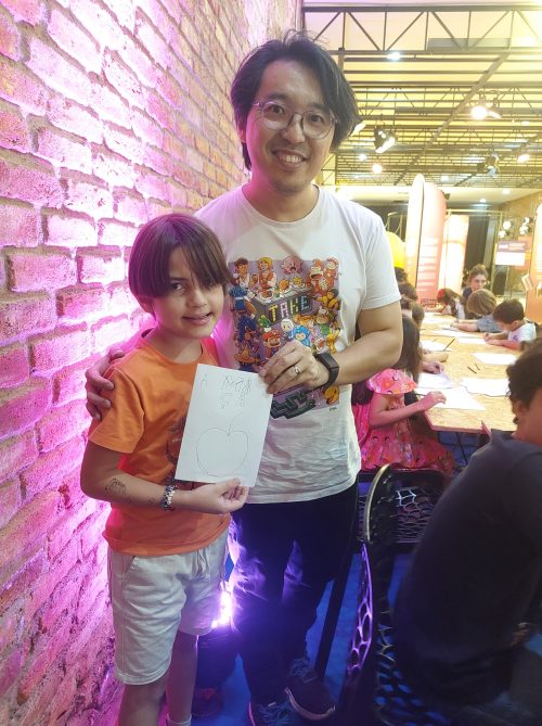 Até que duas coisas aconteceram, num mesmo domingo – mais precisamente, no dia 26 de outubro: ele participou da oficina de tirinhas do Ricardo Tokumoto, na programação do FLI BH, e de lá fomos assistir ao filme Mauricio de Sousa, sobre o grande quadrinista do Brasil, que, aos 90 anos, viu seu filho Mauro Sousa interpretá-lo na telona.