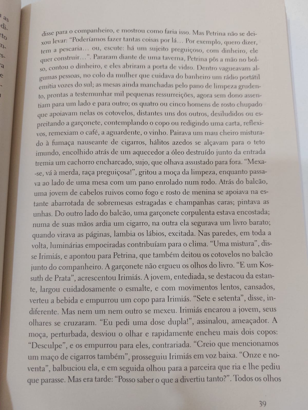 Mas, apesar de todos esses pontos positivos, não é um livro fácil nem agradável. Terminei a jornada extenuada, como se tivesse eu mesma naquele assentamento grotesco dos infernos, ou dentro daquela casa imunda do médico obeso e obsessivo, e com a certeza de que, se não fosse o clube do livro, talvez eu tivesse pegado o atalho mais fácil já nos primeiros capítulos (ou passos do tango): o da desistência.