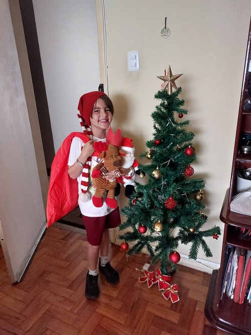 Luiz pronto para distribuir os presentes para a família.