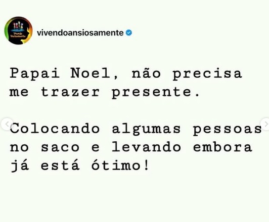 Se bem que, pelos memes que vi hoje no Instagram (aí embaixo), parece que esse negócio de espírito natalino foi enterrado no mesmo momento em que apareceram a pandemia da Covid, a polarização das famílias e a uberização dos trabalhos. Olha só: