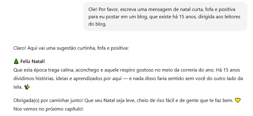 Mas, bom, sentei neste computador agora pra escrever uma mensagem fofa de Natal e só escrevi coisas ruins. Será que apago e começo de novo? Posso também aderir à modinha e pedir ao ChatGPT para escrever uma mensagem de Natal fofa.