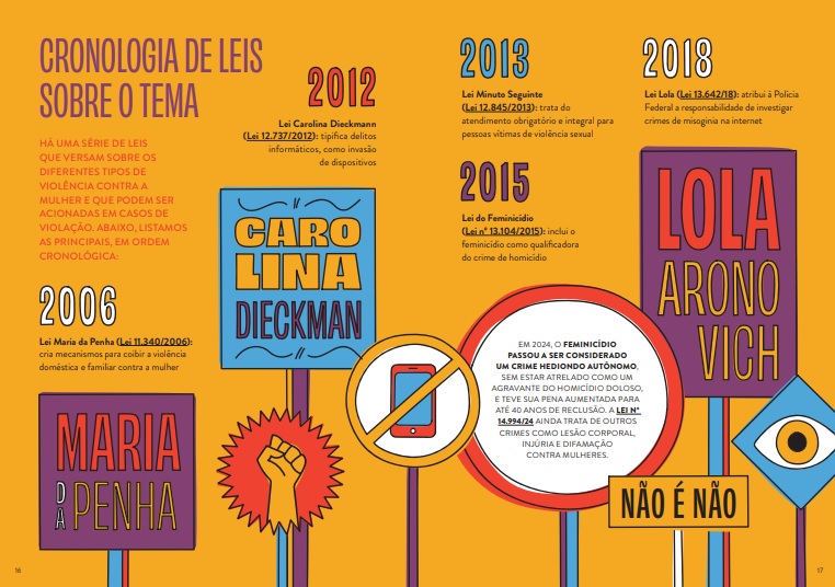 - Violência sexual: “Estupro ou qualquer ato sexual não desejado, que ocorra sem o consentimento da mulher, seja por meio de força, coação ou intimidação. Inclui também violações aos direitos reprodutivos, como impedir acesso a métodos contraceptivos ou forçar a mulher à gravidez ou ao aborto.” Importante: “No Brasil, qualquer ato sexual com menores de 14 anos é considerado estupro de vulnerável.”